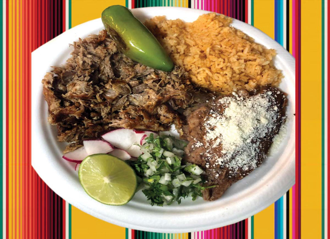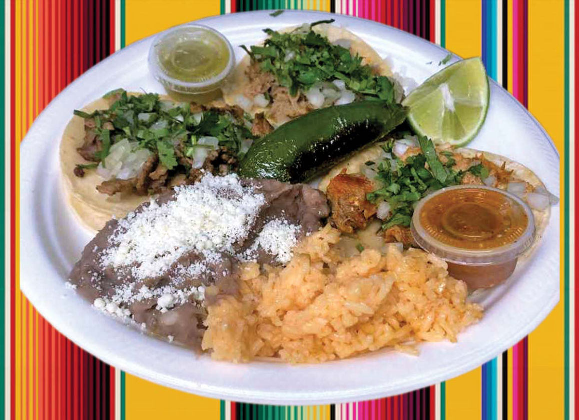 Tacos (Meat of your choice), Rice, Beans, Sauce, Cheese, Onions, Coriander and Jalapeño.