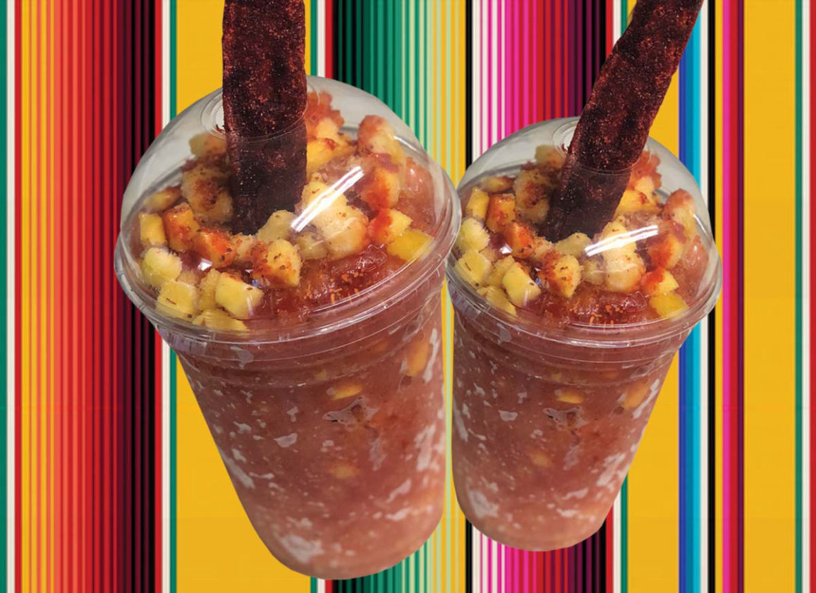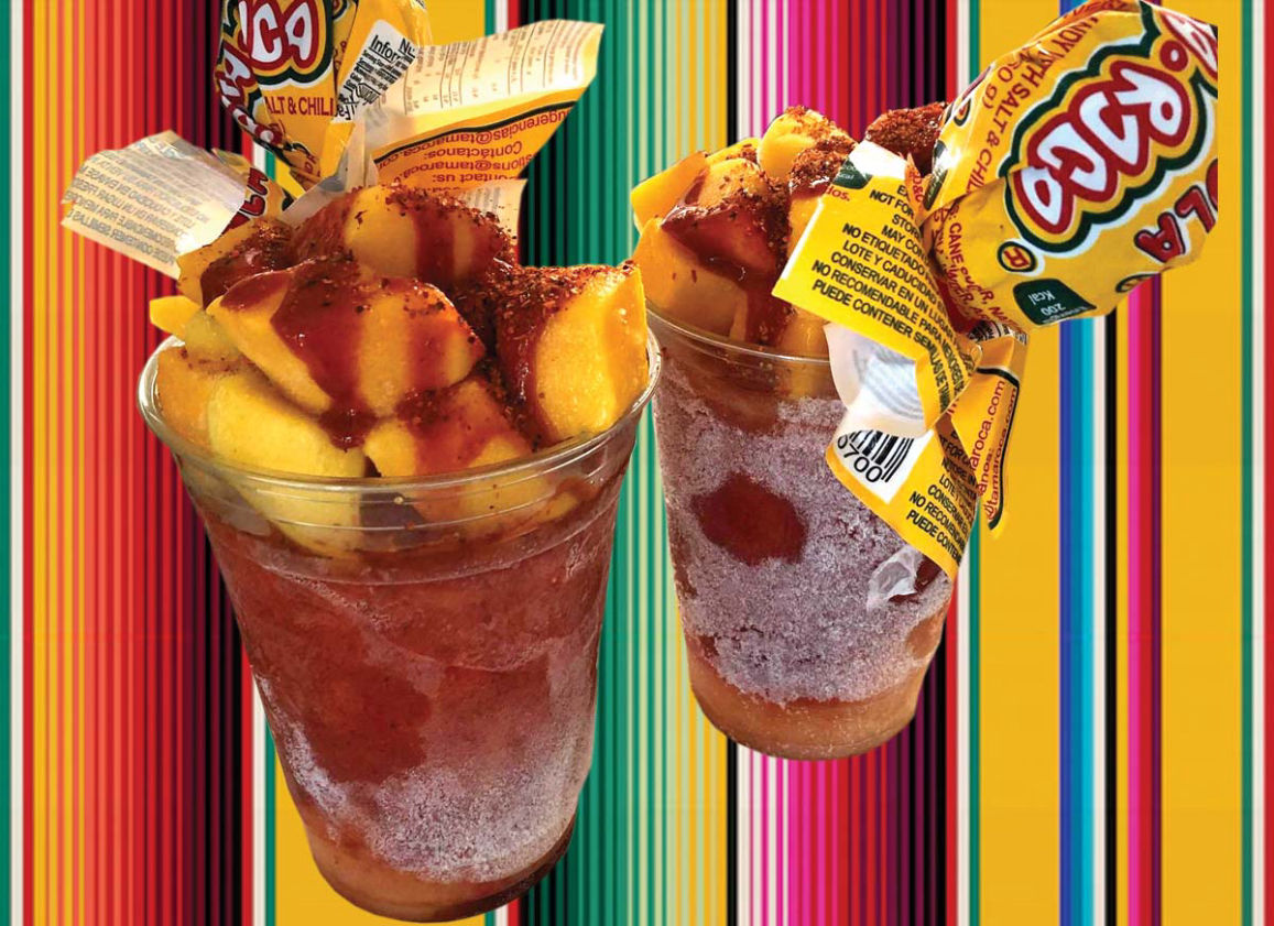 Frozen Mango pulp, Tajin Sauce, Lemon and Chamoy.