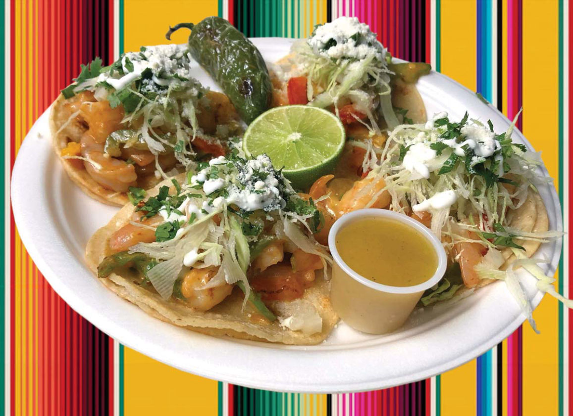 Camarón, Pico de Gallo, Repollo, Crema, Queso, Bell Pepper y Salsa Chipotle.